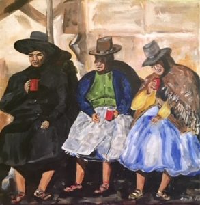 Chilenische Frauen sitzen auf einer Bank und machen mit einem Getränk Pause.